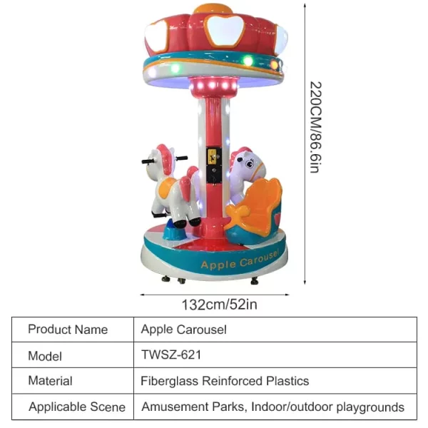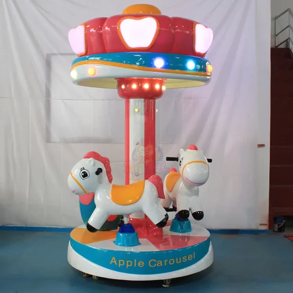 The Apple Coin Operated Kids Carousel is a premium, compact-sized ride designed specifically for children. It masterfully blends classic merry-go-round joy with a modern “Apple” aesthetic. By utilizing top-tier fiberglass craftsmanship and immersive LED light-and-music synchronization, it transforms any location into a magical wonderland. For operators, this is more than just an amusement device—it is a highly effective, high-traffic generator that increases dwell time, boosts venue ambiance, and maximizes overall profitability.